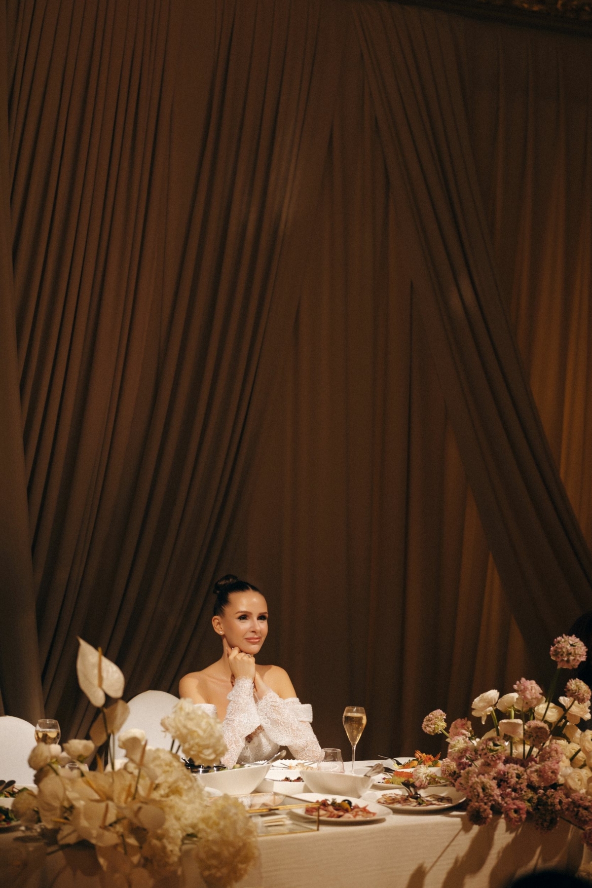 После церемонии гости возвращались в зал, где происходила резкая смена настроения. Пространство полностью переосмыслили за счет нейтрального текстиля теплого кремового оттенка, который закрыл периметр и убрал лишние визуальные акценты. Так основной фокус сместился на свет, свечи и флористику. Ужин стал теплым, камерным продолжением дня, контрастным по отношению к холодной уличной сцене.