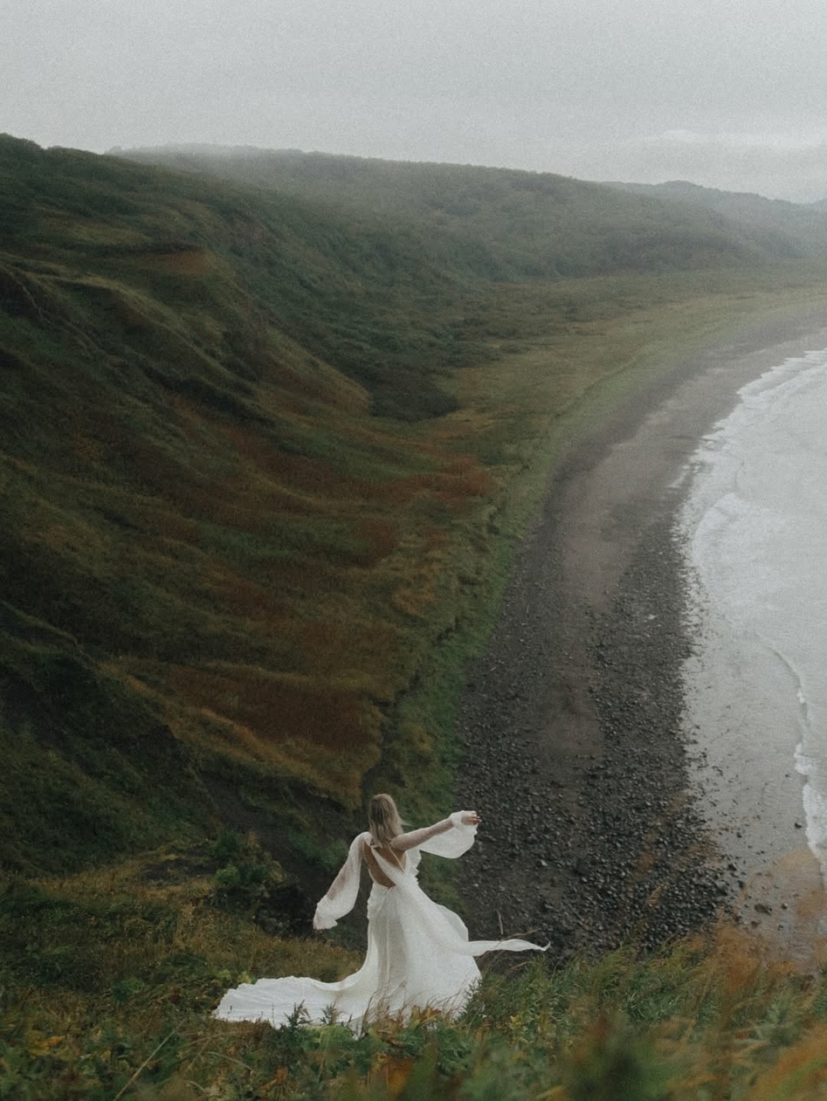 Камчатка идеально подходит для формата свадьбы для двоих или микросвадьбы только с самыми близкими — без банкета, но с невероятным визуальным эффектом. Вертолетная прогулка к вулканам, кадры на фоне океана, утренний туман и ветер, который живет своей жизнью. Самая известная и визуально мощная локация — Халактырский пляж. Черный вулканический песок, Тихий океан, горизонт без границ и ветер, который живет по своим законам. Церемония здесь выглядит почти сюрреалистично: светлое платье на фоне графитового берега, волны и открытое небо. Есть и более мягкие варианты: бухта Тихая, Вилючинская сопка с панорамами на залив, дикие пляжи в сторону Паратунки.