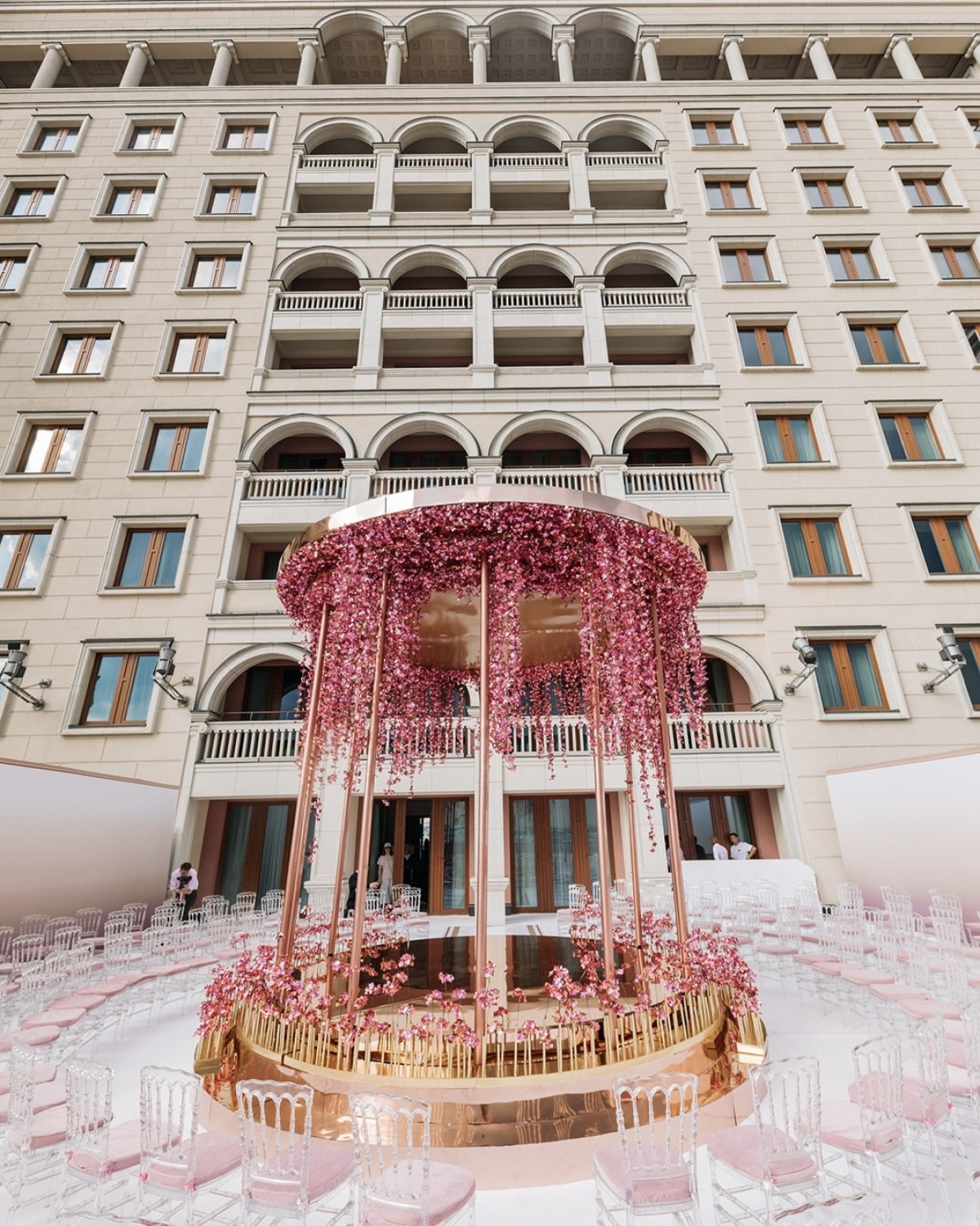 Atelier dei Fiori работают в Москве, Дубае и Европе, и это сразу говорит о широте задач и локаций. Пожалуй, один из самых знаковых проектов студии — «Начало бесконечности», который они реализовали совместно с Wedding People на «Вилле Микетти» прошедшим летом. Он удостоился множества публикаций и цитирований — от главного по эстетичным свадьбам @thewed до международных аккаунтов, собирающих архитектурные решения в event-среде. В этих репостах проект часто называют показателем того, как современный декор может взаимодействовать с пространством и формировать новый язык свадебного визуала.