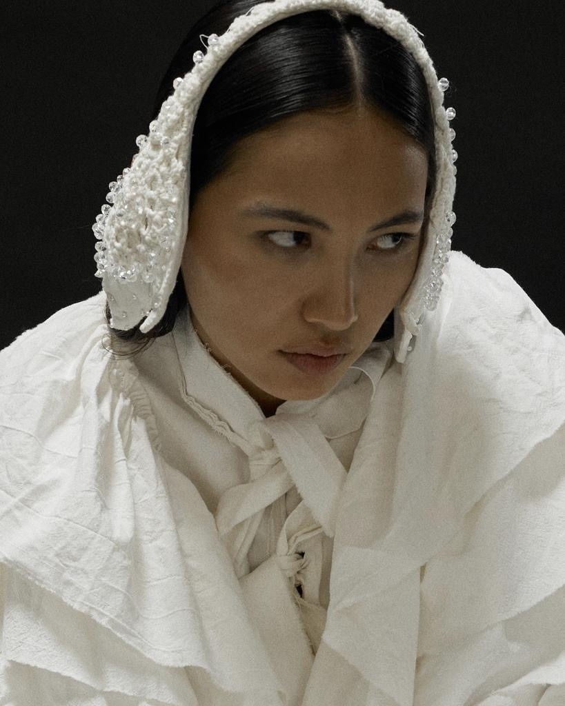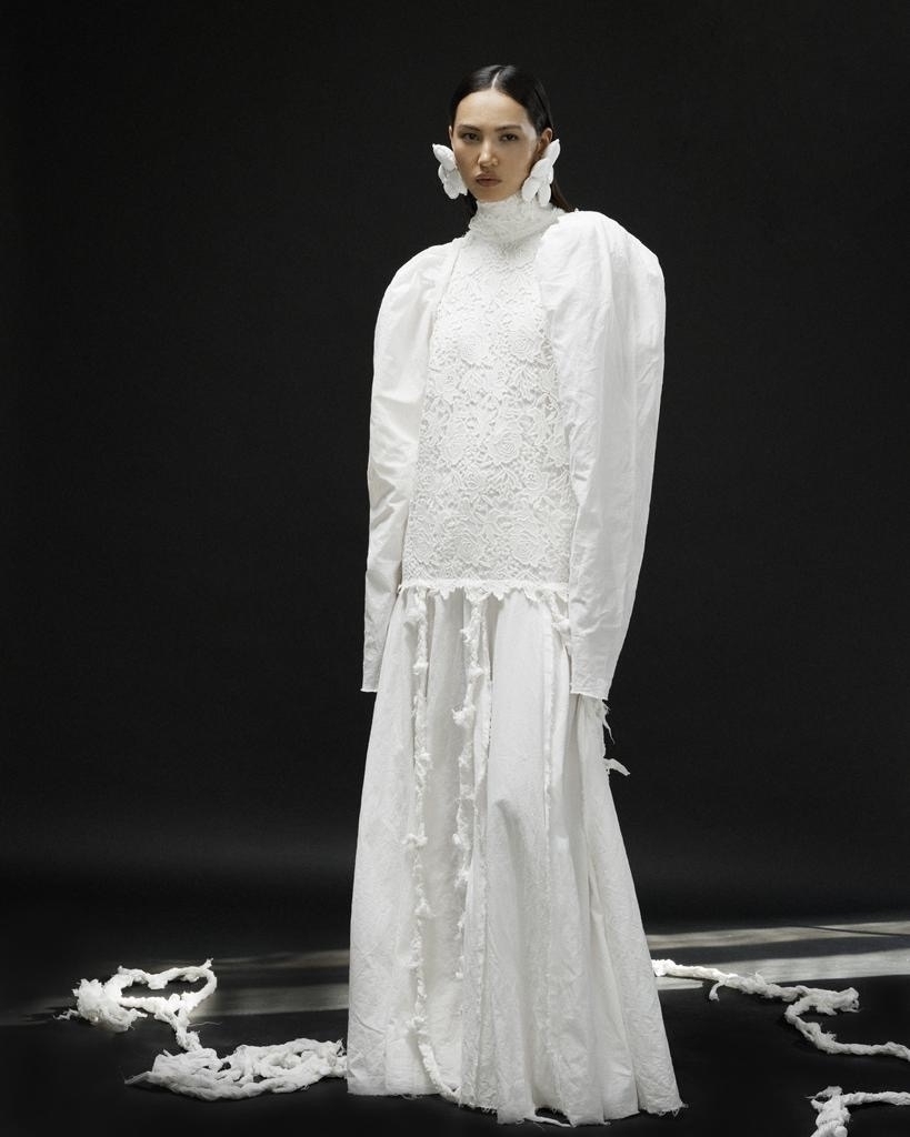Локальный и исконно русский бренд Gapanovich про современное прочтение традиционного костюма народов севера, поэтому в основе коллекций — многослойные сарафаны, свободные сорочки и акцентные аксессуары с отсылкой к прошлому. И если в регулярных линейках представлены более повседневные модели платьев, то в свадебной «Царь-девице» одежда по-настоящему сказочная. Дроп для невест сочетает в себе разные традиционные техники шитья, деконструктивные элементы, драпировки и броскую отделку из бисера, пайеток, перьев и драпировок.