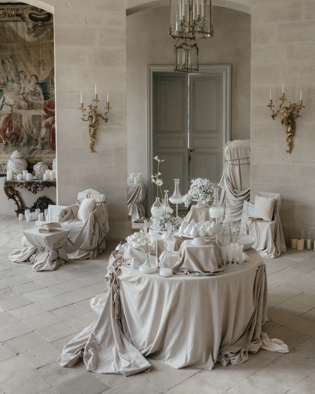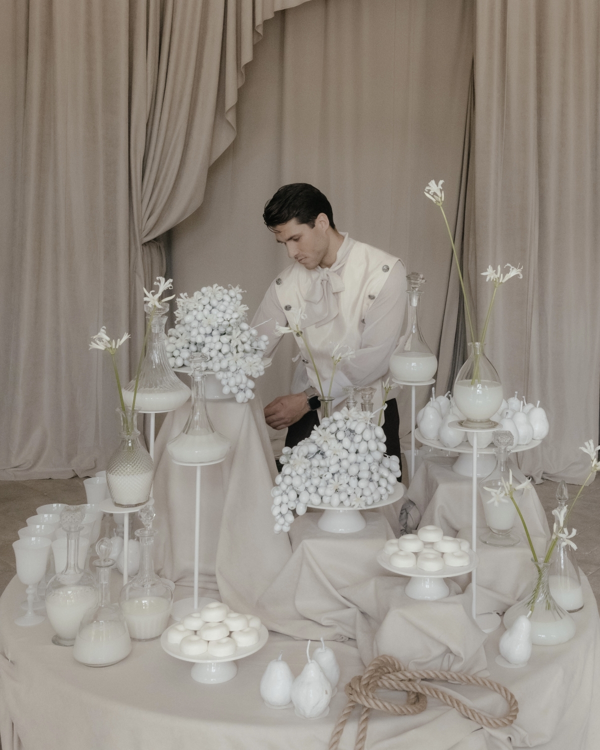 Если речь идет про стиль оформления пространств, костюмов актерской труппы и музыкальной группы «Министерство Культуры», я бы назвал его будуарным шиком. Тут важно сказать, что мы не занимались реконструкцией эпохи. Да, задавали примерную рамку времен. Но скорее для ощущений, чем для точного считывания. В этом проекте не было никакого историзма. Это красивая фантазия, сказка, которая родилась и случилась на глазах у двенадцати гостей и двух виновников происходящего.