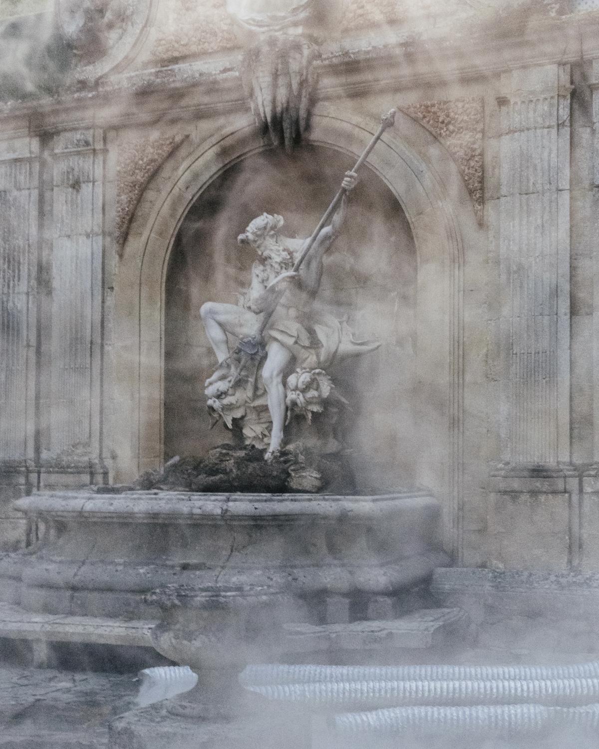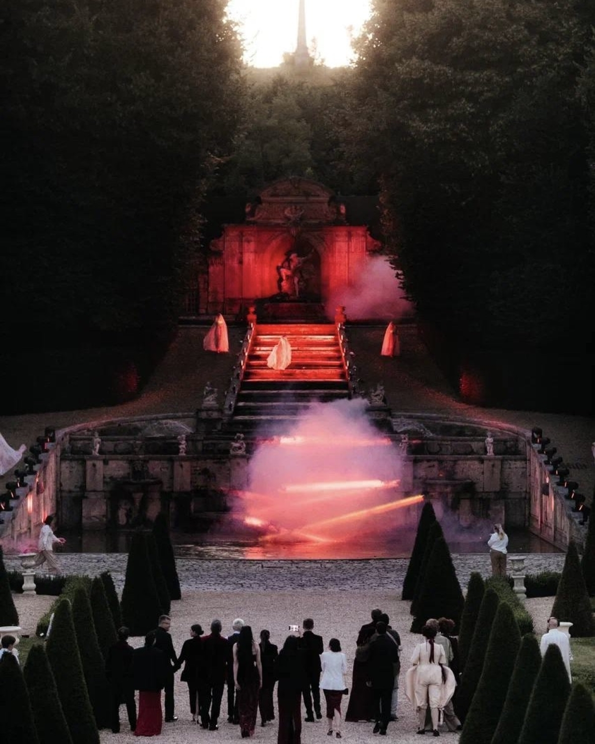 Парк постепенно накрывало густым дымом, где вдруг оживали женские статуи. Жан-Батист рассказывал легенду о своих бывших женах, которых он облачил в камень. Перед террасой замка между героями завязывался конфликт, персонажи перемещались вдоль парка к каскадному фонтану, и гости следовали за ними. В этот момент по ступеням хлынули потоки воды, фонтан окрашивался в плотный красный цвет. Все работало на этот накал момента, потому что следом здесь разворачивалась настоящая дуэль. Сюжетные страсти, конечно, не разрешались до конца первого вечера. И с наступлением ночи парк переходил во власть диджея: гости получали возможность просто выдохнуть, потанцевать и свободно пообщаться.