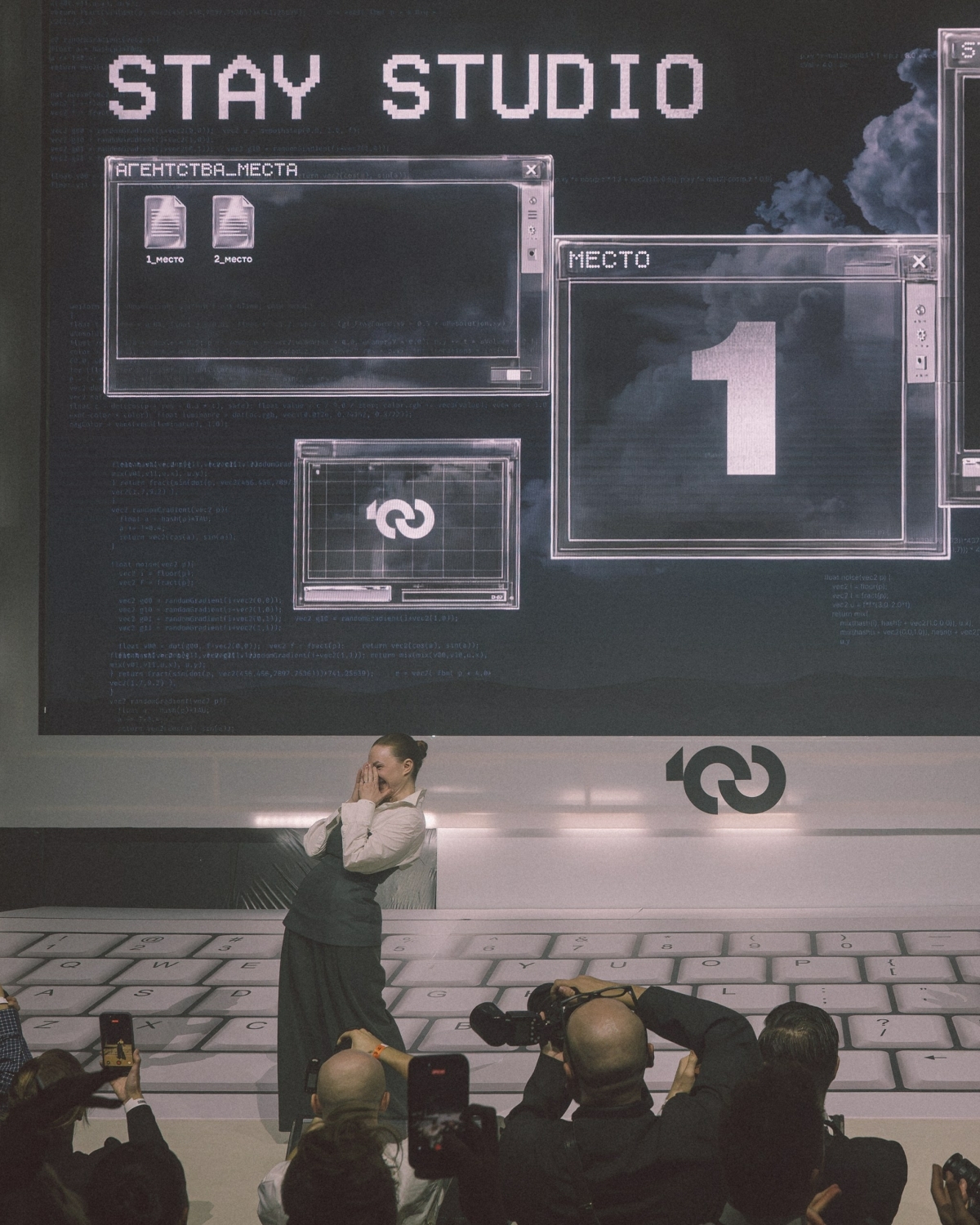 Три сцены, каждая со своей ролью. Гигантские цифры «100» — одновременно фотозона и точка вручения. «Карьерная лестница» — буквальный пьедестал, по которому поднимались участники в зависимости от места. Главная сцена с образом монитора и клавиатуры — для финальных блоков и ключевых наград.