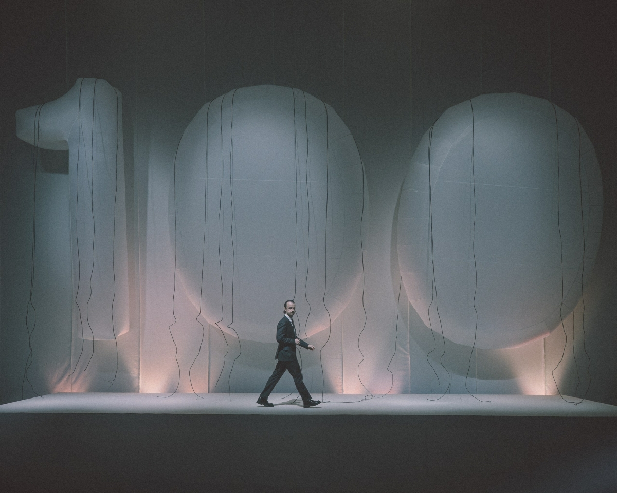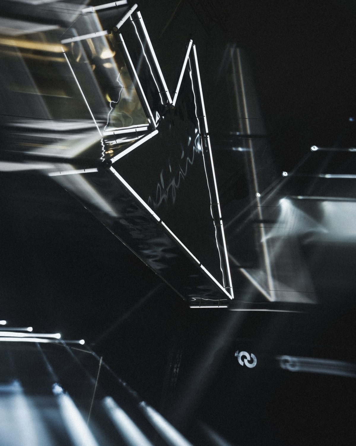 Главным решением стал подвесной курсор в центре зала: зеркальная поверхность, светодиодные трубки Astera, лазеры — и ротационный мотор, который позволял буквально разворачивать внимание тысячи человек от сцены к сцене. Световые трубки по всему пространству отсылали к люминесцентным офисным лампам и одновременно работали как сценографический элемент. Театральный свет управлял ритмом происходящего — усиливал напряжение в ключевые моменты и отпускал его там, где нужно было дать залу выдохнуть.