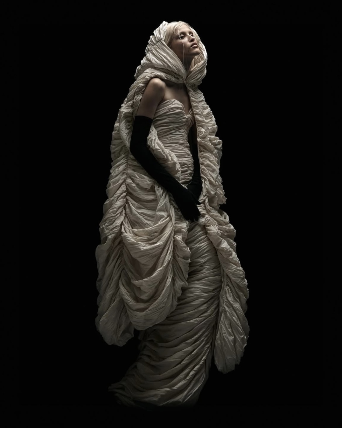 Сюрреализм только начинает набирать обороты, поэтому в сезоне-2026 ждите платья с огромными капюшонами и воротниками. На их фоне ваша шея покажется более хрупкой, а образ станет куда заметнее. Правда, стилизовать платья с такими гиперболизированными деталями нелегко: распущенные укладки с крупными локонами непреднамеренно могут добавить ненужный объем в зоне декольте, а броские украшения утяжелят образ.
