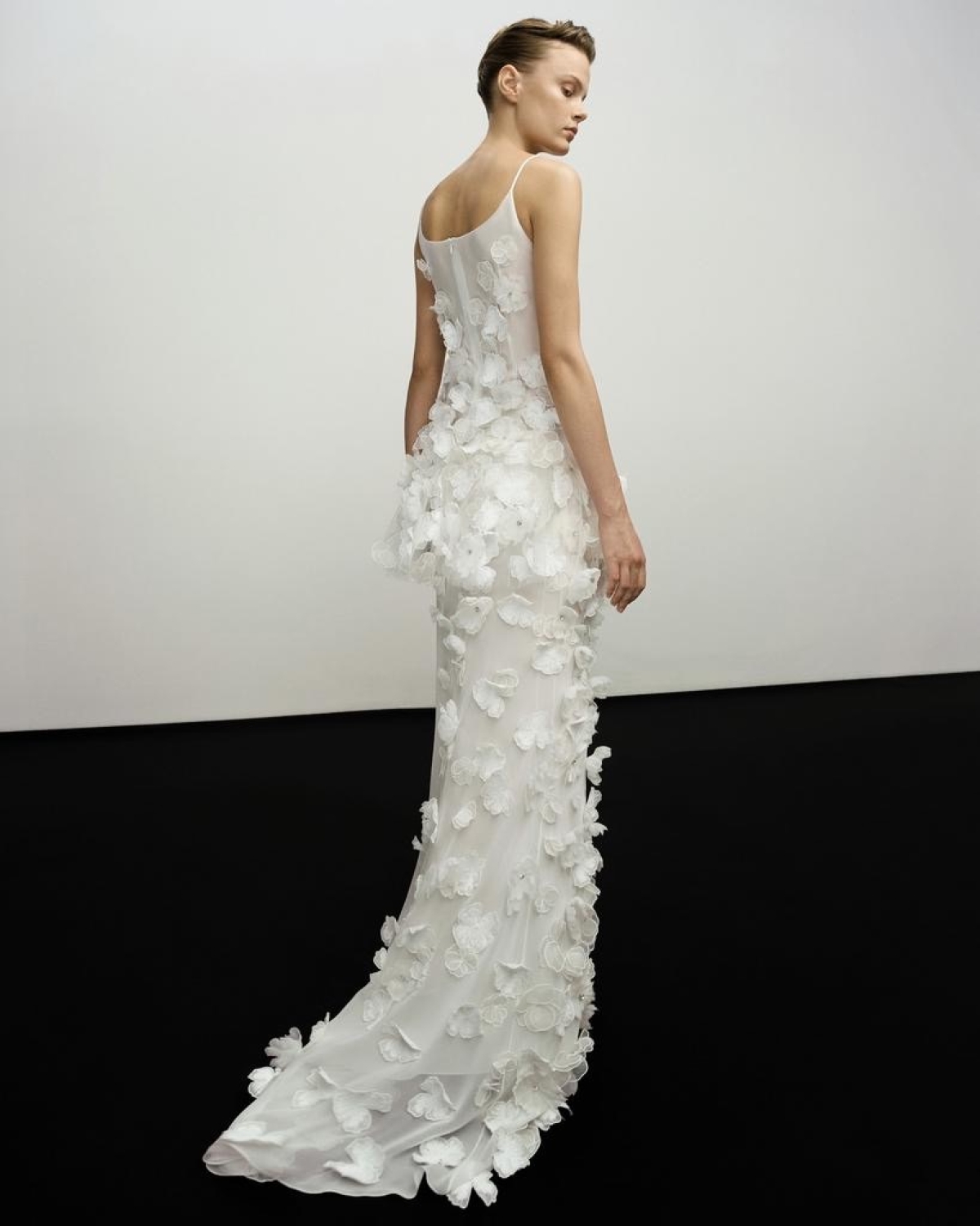 Все новое — хорошо забытое старое, поэтому свадебная классика прошлых лет с легким кружевом и цветочным 3D-декором возвращаются. Модель платья при этом может быть любой: структурное мини, струящаяся комбинация, силуэтная «рыбка» или пышное в пол. Но важно, чтобы основной акцент был на цветочном кружеве. Эта отделка визуально облегчает сложный крой и создает ощущение невесомости, даже если в основе платья плотная тяжелая ткань.