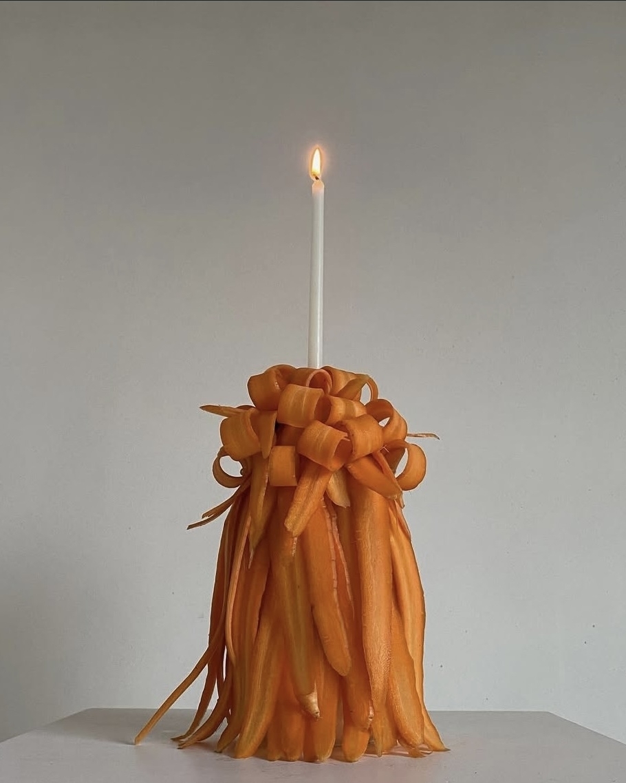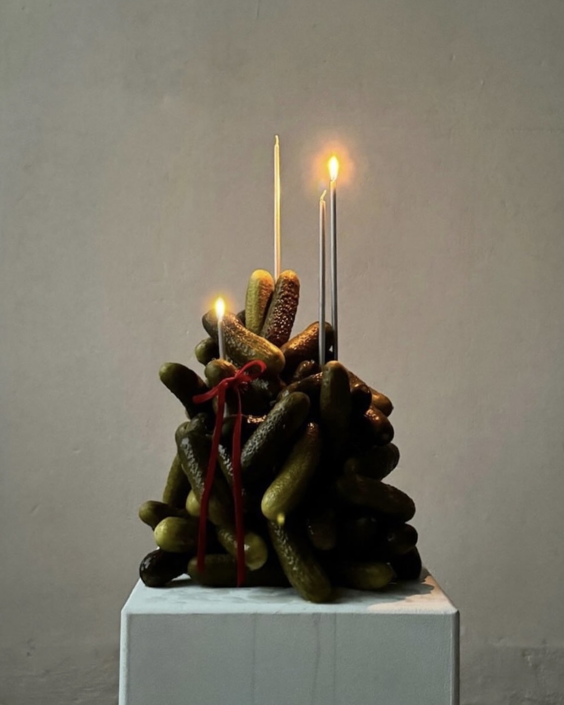 Аккуратно в оформлении дома на Новый год — 2026 нужно использовать не только золотой, но и зеленый. Вообще, все холодные оттенки в этот раз табу, но цвета травы — исключение. Это то, чем питается Красная Огненная Лошадь, поэтому без зелени в сервировке стола точно не обойтись. Здесь можно поэкспериментировать с подачей и, например, собрать инсталляции из огурцов, горошка и капусты. Зеленым можно также украсить и елку, но важно оставить бо́льшую часть дерева в натуральном нетронутом виде.