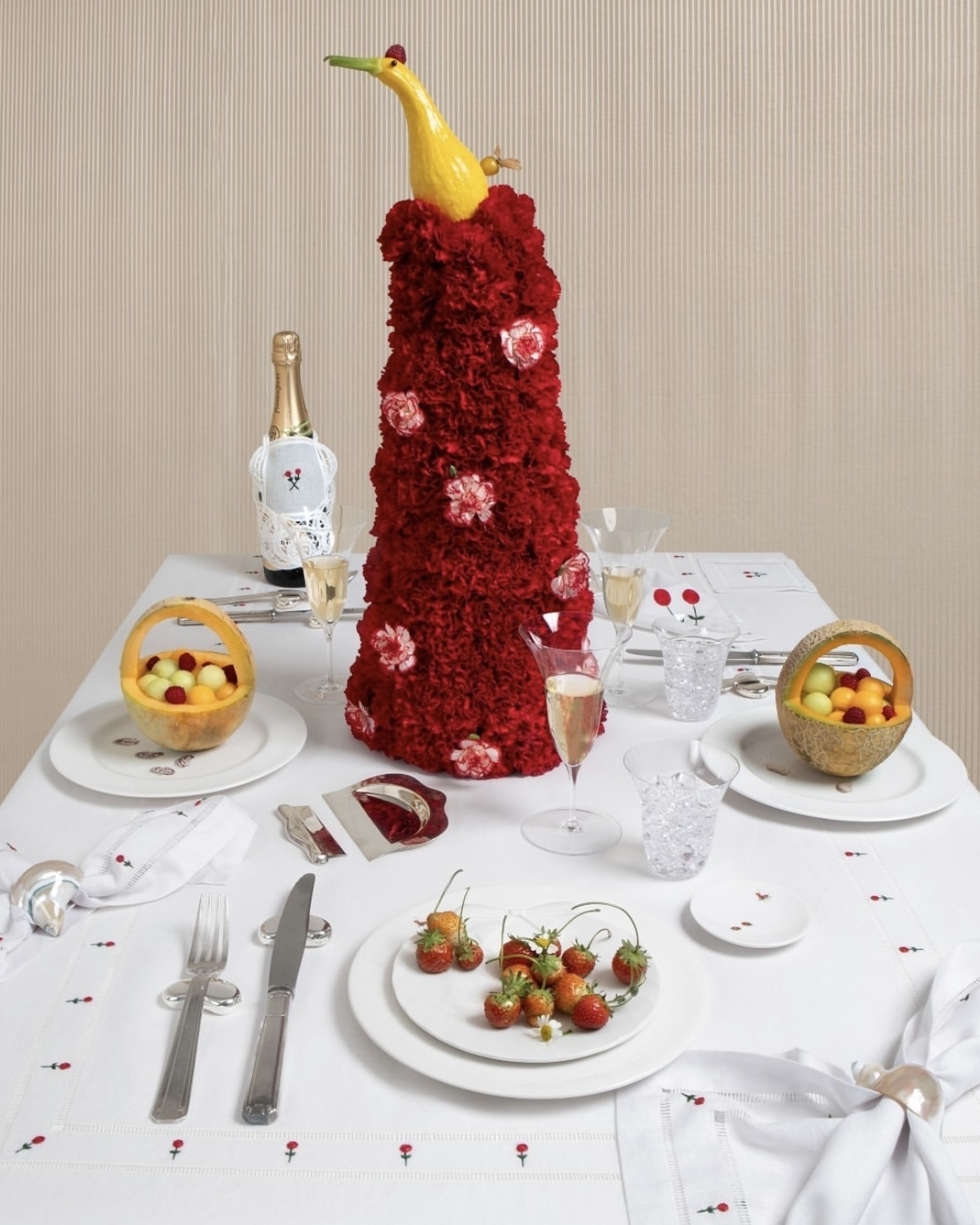 Красный — новогодняя классика вне зависимости от предпочтений символа года. В 2026 использовать его нужно в качестве основы оформления, но только если вы сами испытываете симпатию к яркости. Для этого подойдут красные елочные игрушки, текстиль из натуральных материалов или специально задрапированные тканями зоны, которые послужат фоном для фотографий. Добавлять главный цвет 2026 года в интерьер можно точечно. Например, с помощью цветочных инсталляций, фуд-дизайна или небольшого декора: посуды, свечей или уютных статуэток. Красный в оформлении также предлагаем миксовать с винным: так пространство будет выглядеть многослойнее и интереснее.