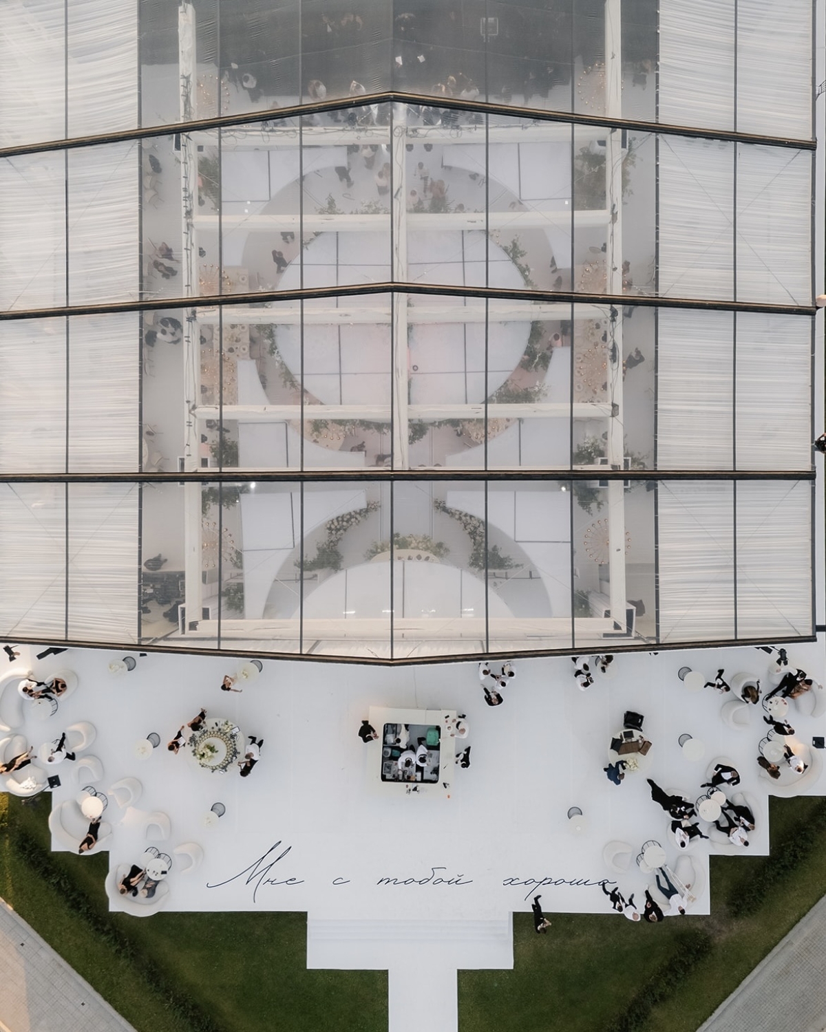 Концепт свадьбы назывался «Мне с тобой хорошо». Простая фраза, ставшая символом глубины их чувств. Эти слова, сказанные когда-то женихом, стали лейтмотивом отношений и органично легли в основу вечера. Пара говорит их друг другу постоянно, оставляет маленькие записки — и они появились в деталях оформления, на экранах и — особенно трогательно — на входной группе шатра, будто написанные от руки.
