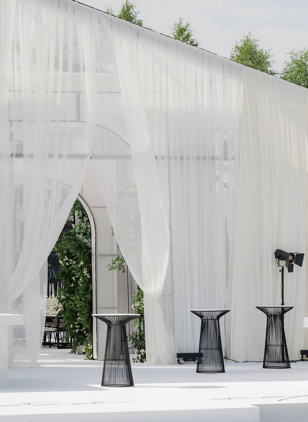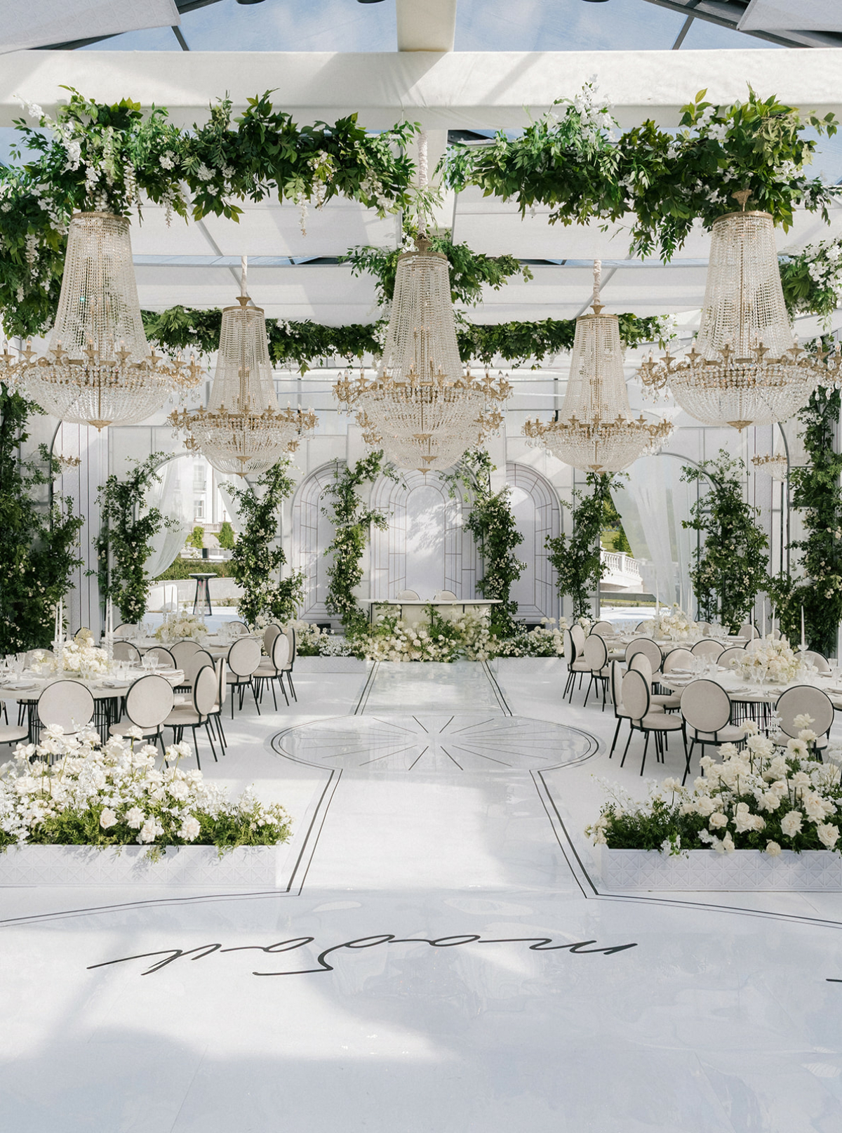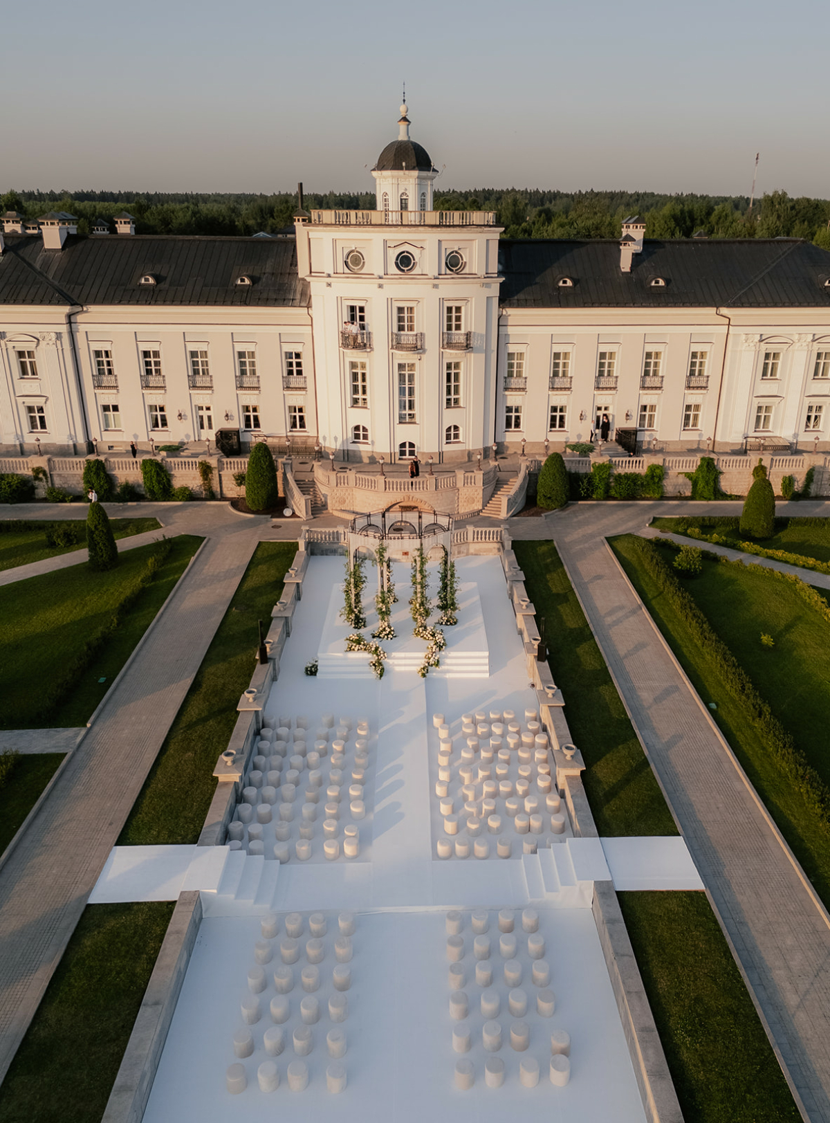 Великолепная Villa Michetti с ее идеальными симметриями стала декорацией к истории, в которой классика обрела новую легкость. Чтобы разместить всех 150 гостей, на одной из полян возвели огромный шатер — открытую площадку с легкими драпировками по периметру. Пространство превратили в архитектуру света и воздуха: в теплый июльский день шатер дышал свежестью, а белые ткани мягко колыхались от ветра. В оформлении использовались только живые цветы и зелень. Белый и зеленый стали визуальной метафорой пары — искренности, естественности, гармонии.