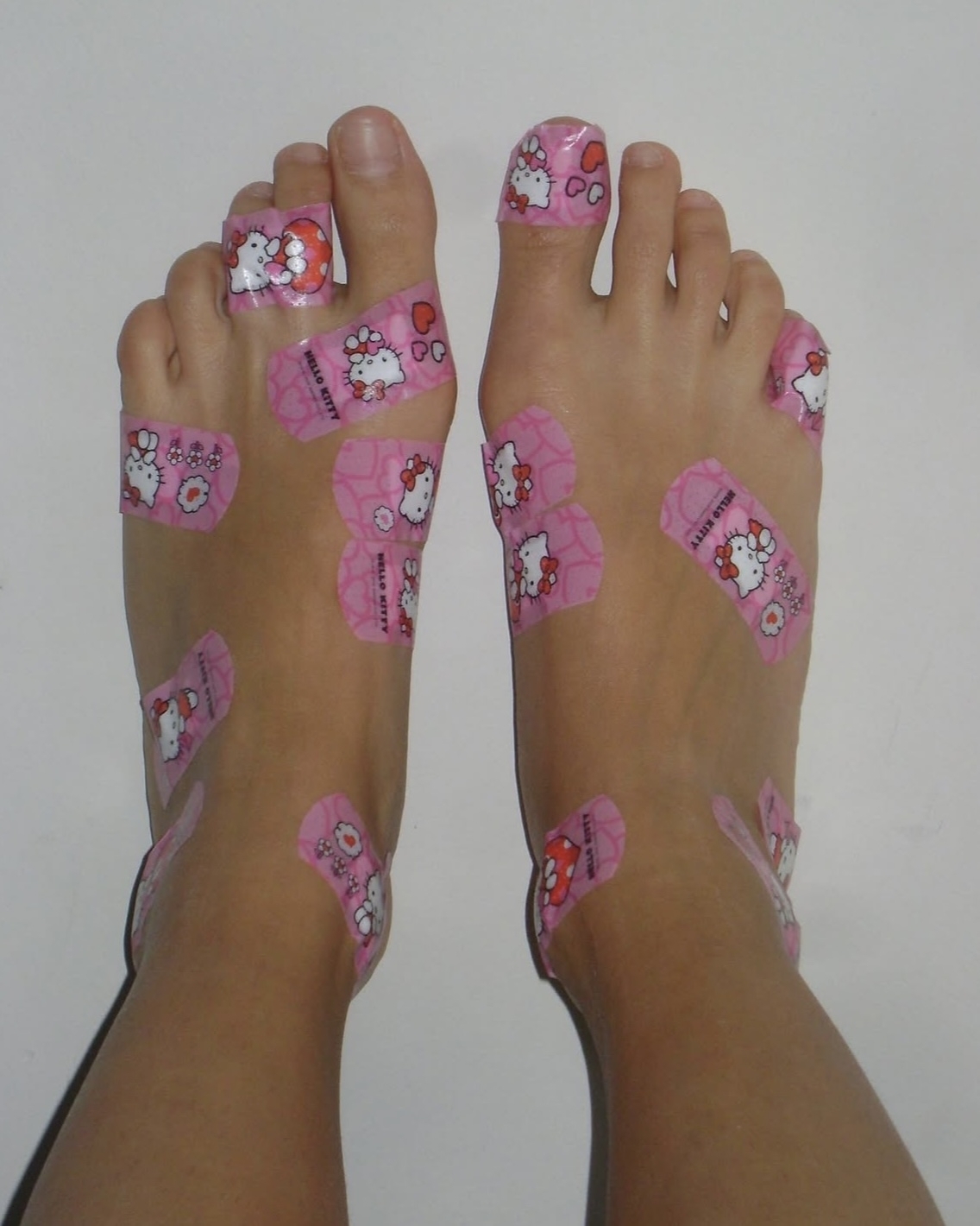 Самый простой и эффективный способ скрыть натертые обувью места — использовать пластыри и ленты. И если простые бежевые или прозрачные гелевые делают образ неаккуратным, то варианты с узорами и рисунками, наоборот, добавляют стиля и индивидуальности. Носить дизайнерские пластыри лучше с минималистичными босоножками, и важно, чтобы рисунок не спорил с настроением всего образа. Поэтому на свадьбу в классической эстетике этот вариант вряд ли подойдет, а вот для инфантильных и игривых концепций — вполне.