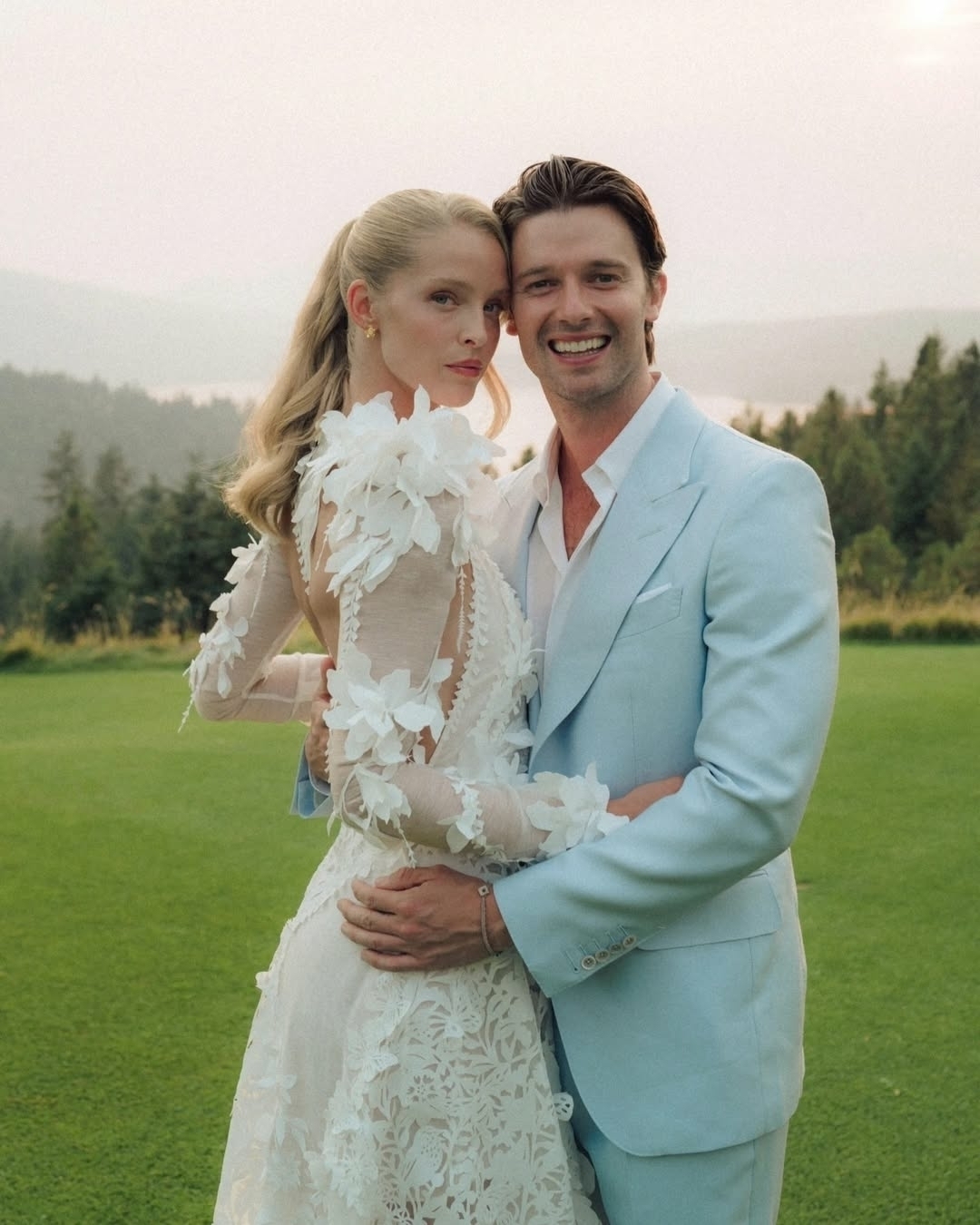 После десяти лет отношений Патрик Шварценеггер и Эбби Чемпион отпраздновали свадьбу на озере Кер-д’Ален в Айдахо. Праздник длился три дня: репетиционный ужин, барбекю в стиле вестерн и, наконец, официальная церемония. Невеста успела сменить три платья: романтичное Zimmerman, кружевное Bec + Bridge с черными ковбойскими сапогами и шляпой, а для главного дня — сшитое на заказ платье Danielle Frankel из шелка и шерсти с высоким воротом, глубоким вырезом на спине и подкладкой с ручной росписью.