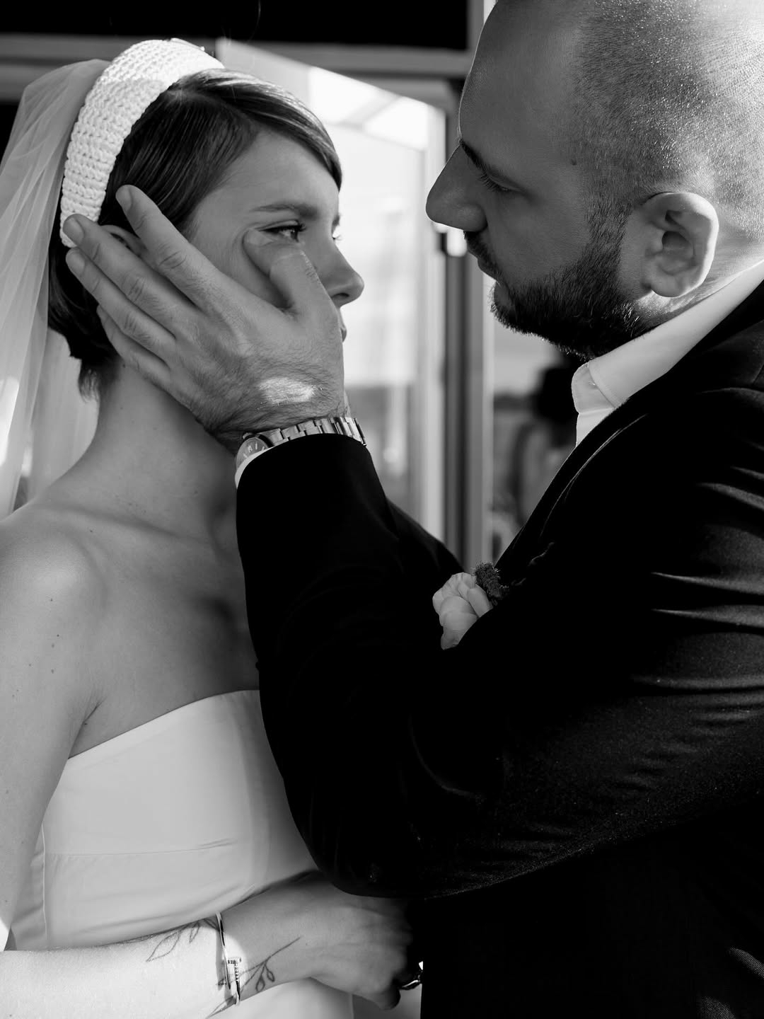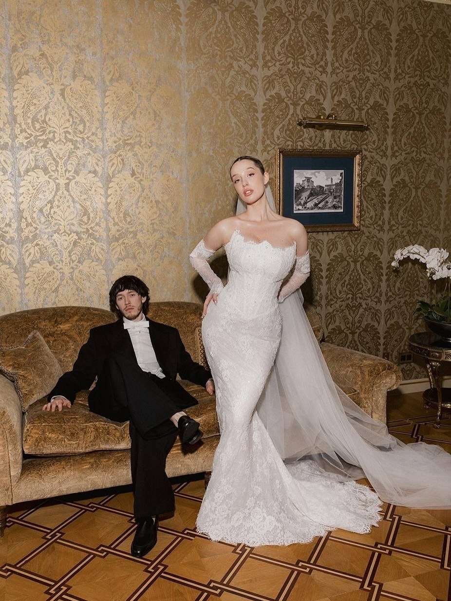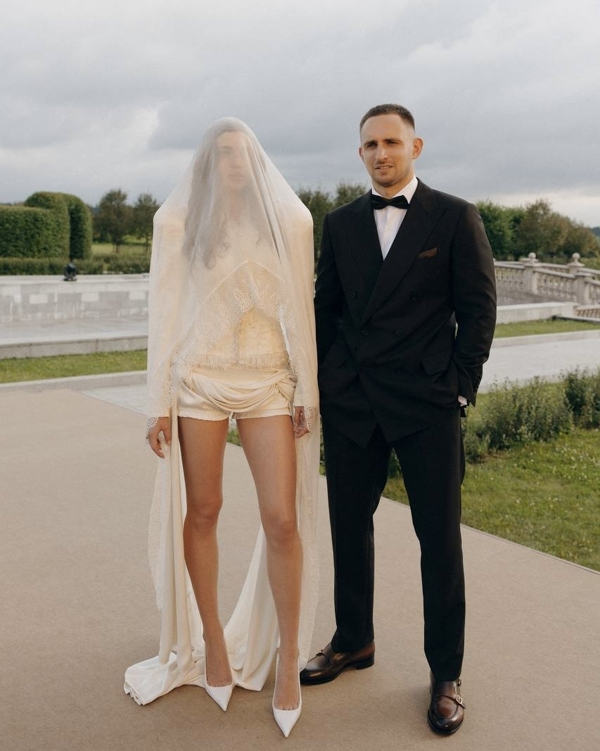 Церемония и правда получилась камерной: ее подробности пара оставила в тайне, опубликовав лишь небольшое видео декора со свечами, по слухам снятое во Воронцовском дворце в Алупке. Невеста выбрала платье Ulyana Sergeenko, которое стилизовала Ксюша Смо. Образ завершила сверкающая тиара Atelier PM, выполненная вручную из серебра 925 пробы и украшенная 1158 фианитами бриллиантовой огранки.