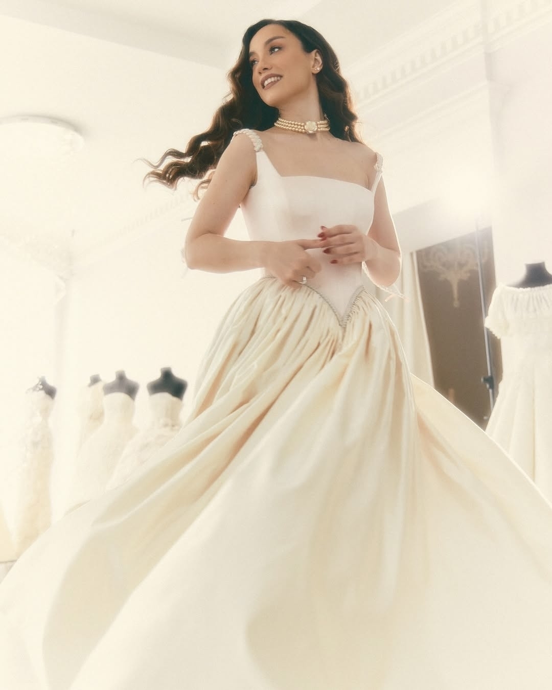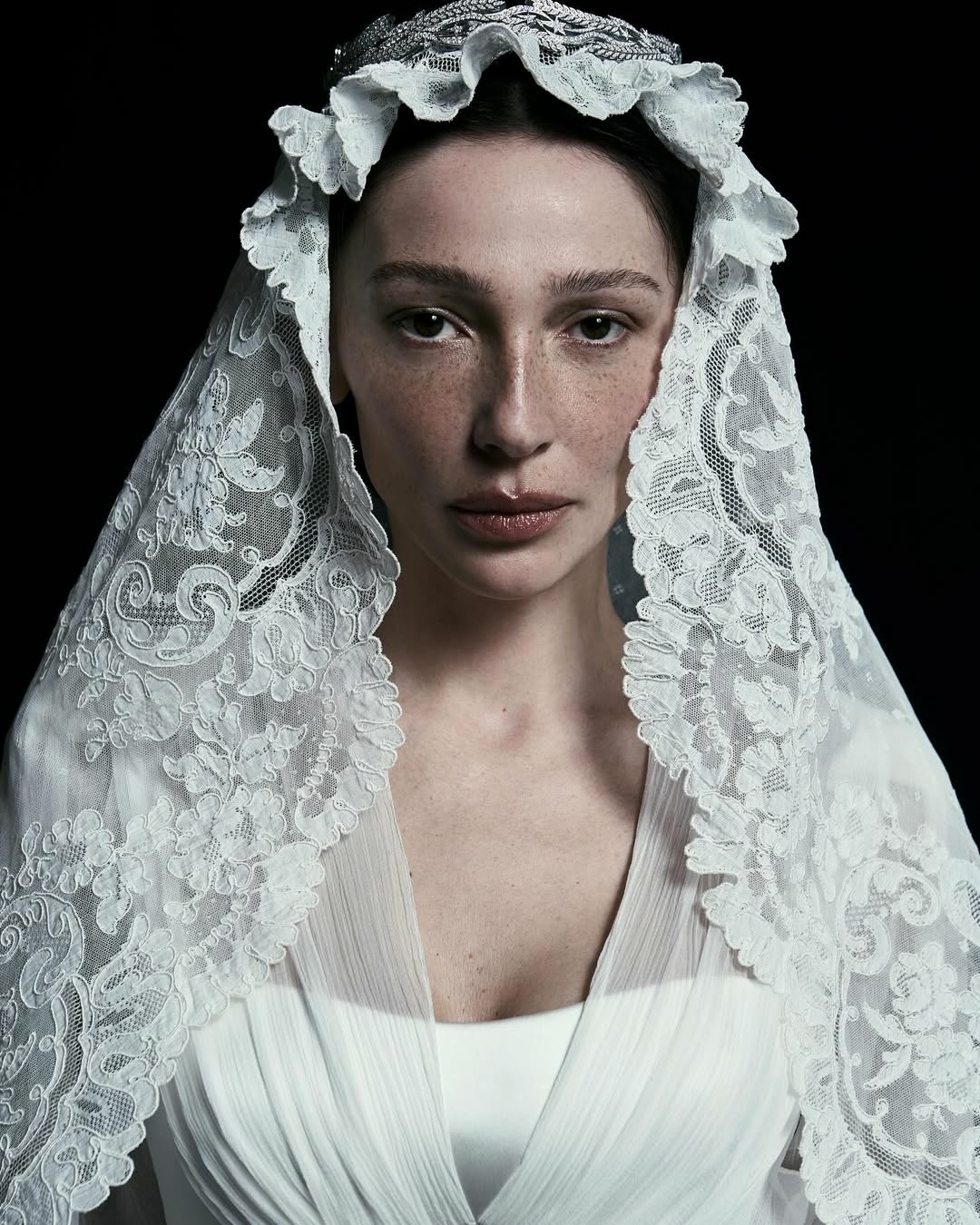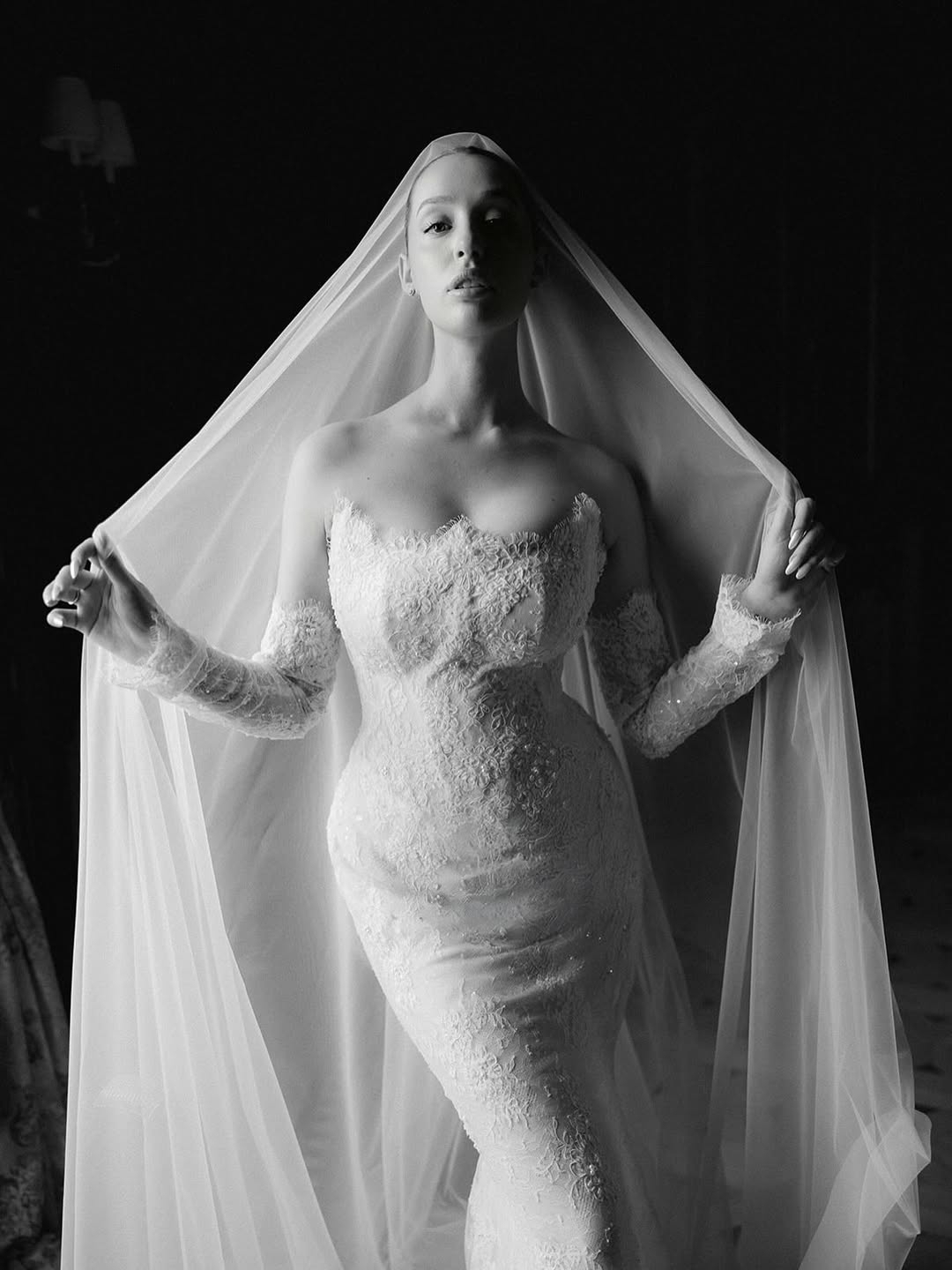 Церемония и правда получилась камерной: ее подробности пара оставила в тайне, опубликовав лишь небольшое видео декора со свечами, по слухам снятое во Воронцовском дворце в Алупке. Невеста выбрала платье Ulyana Sergeenko, которое стилизовала Ксюша Смо. Образ завершила сверкающая тиара Atelier PM, выполненная вручную из серебра 925 пробы и украшенная 1158 фианитами бриллиантовой огранки.
