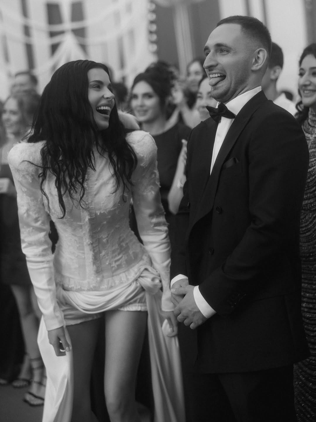 Выездная церемония с цветами пастельных оттенков плавно перетекла в масштабную вечеринку с мощным лайнапом. Невеста выбрала для церемонии кружевное платье Christiwedding, которое позже сменила на короткое мини для танцев. Жених, которого обычно видят в стритстайл-луках, на этот раз предпочел классический черный костюм свободного кроя. Среди гостей были Feduk, Toxi$, Scally Milano, Dilara и другие звезды новой школы. Музыкальная часть завершилась фейерверком под собственные треки Big Baby Tape.