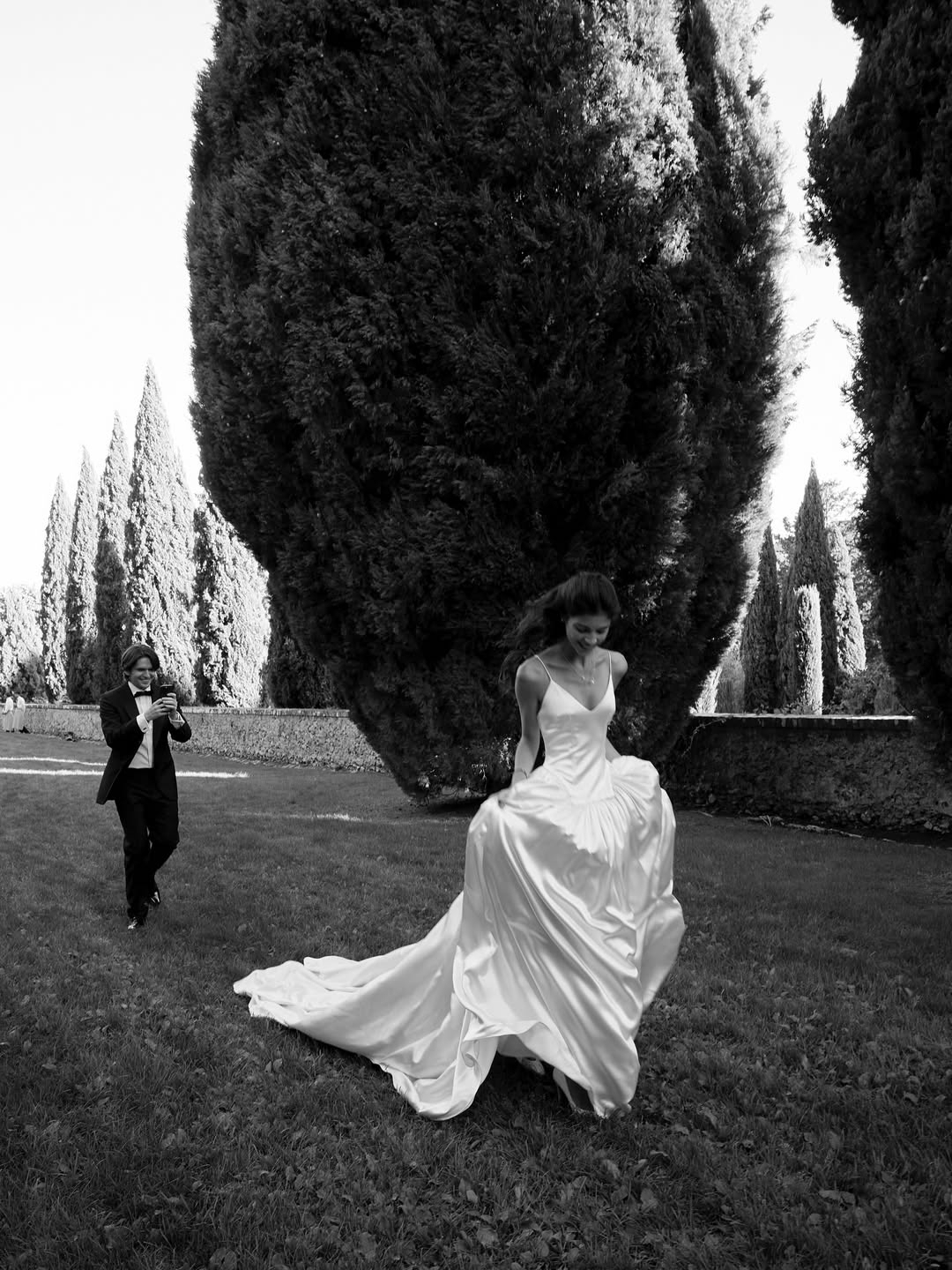 В июле на тосканской вилле La Foce прошла свадьба старшей дочери Оксаны Рим Варвары Протасовой и Степана Симкина — одна из самых атмосферных европейских историй российского светского круга. Варвара выбрала платье Danielle Frankel, вечером сменив его на комбинацию Prada для танцев. Жених был в классическом костюме Tom Ford. Церемония в саду среди олив и кипарисов, ужин за длинными столами под гирляндами огоньков — все это создавало эстетику итальянской деревенской романтики. Среди гостей — московская арт-тусовка и модные дизайнеры, но без чрезмерной медийной огласки: пара делала акцент на slow living и красоте момента.