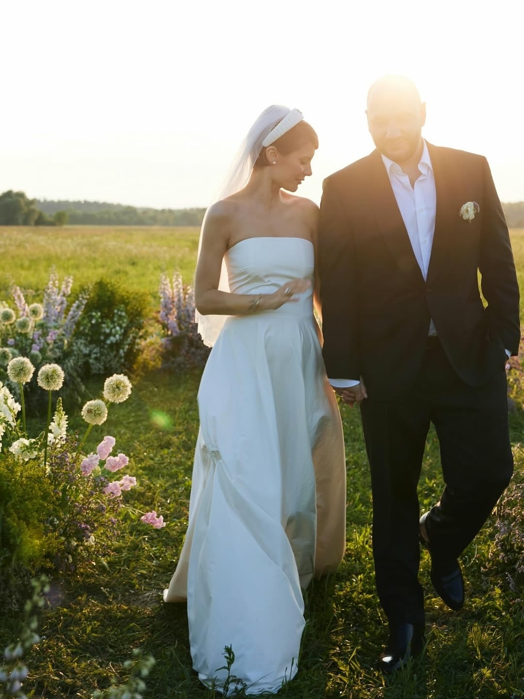 Меню подготовил шеф-повар Дмитрий Париков и его гастропроект «На даче»: на столах — классические летние блюда, закуски и чай из самовара. Пространство украсили полевые цветы, создавая атмосферу загородного летнего праздника. Кристина выбрала лаконичное платье, дополнив его фатой с ободком Prada. Жених остановился на классическом образе без излишней формальности. Закат стал фоном для концерта классической музыки, который завершил этот камерный вечер.