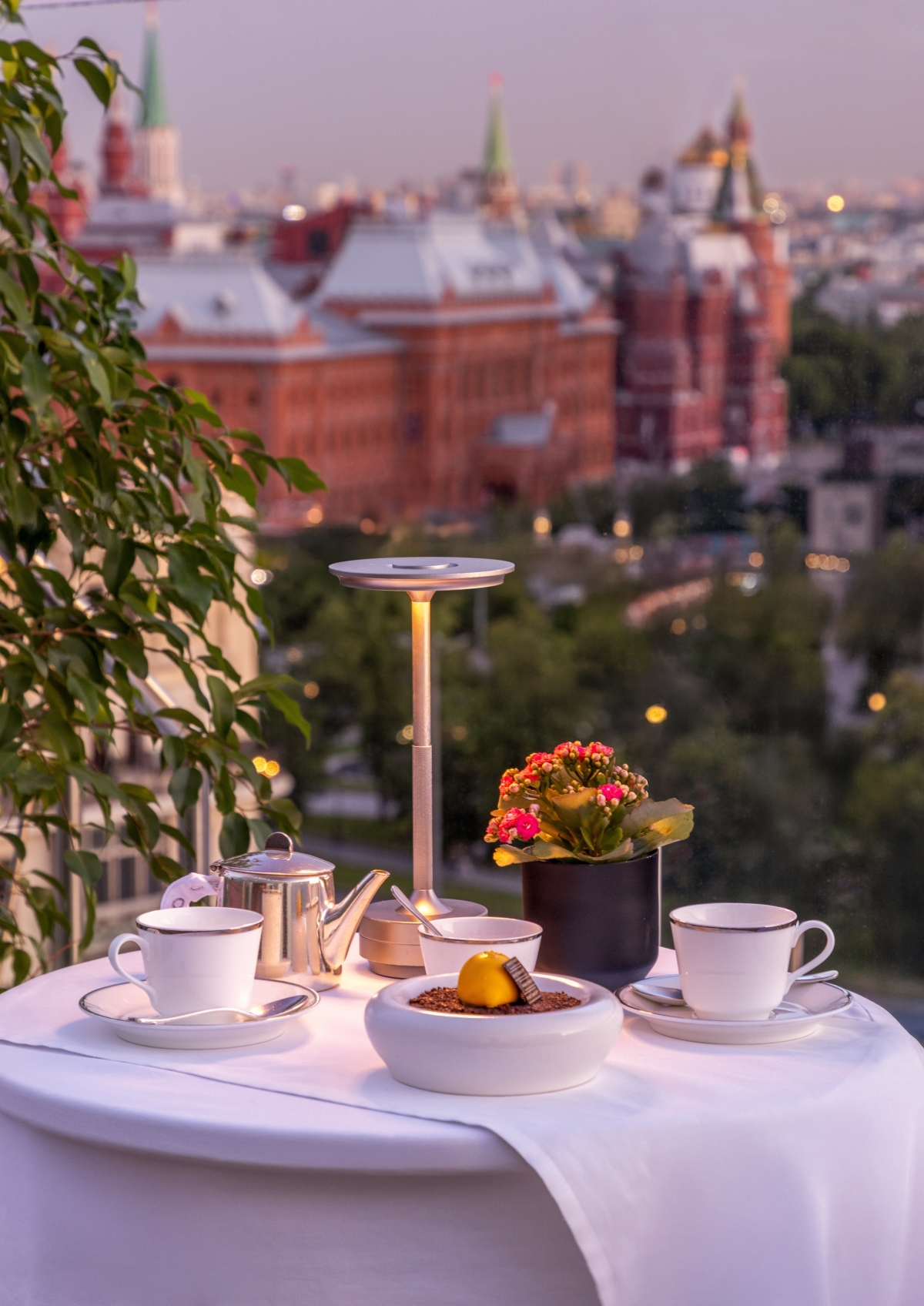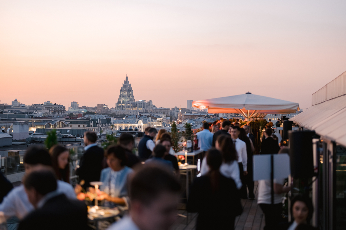 Просторная терраса общей площадью более 200 м² (состоит из 2 террас «Кремль» и «Сити») смотрит прямо на квадригу Аполлона на фронтоне Большого театра через перспективу уникального здания ЦУМа в стиле английской готики. С юго-западной части открывается захватывающий вид на Спасскую башню и Исторический музей, расположенные в самом сердце столицы на Красной площади. Открытая терраса «Кремль» отличается уникальным видом на Кремль и Большой театр. На террасе возможна организация небольших бизнес-завтраков и ужинов от 10 до 15 гостей, а также проведение крупных мероприятий в формате коктейля до 80 гостей под закрытие. Крытая терраса «Сити» камерная и живописная часть, вместительностью до 60 гостей Это место станет идеальным для проведения любого рода мероприятий, особенно небольших, торжеств, таких как свадьба и день рождения. С террасы открывается вид на исторический центр города район Кузнецкого моста.