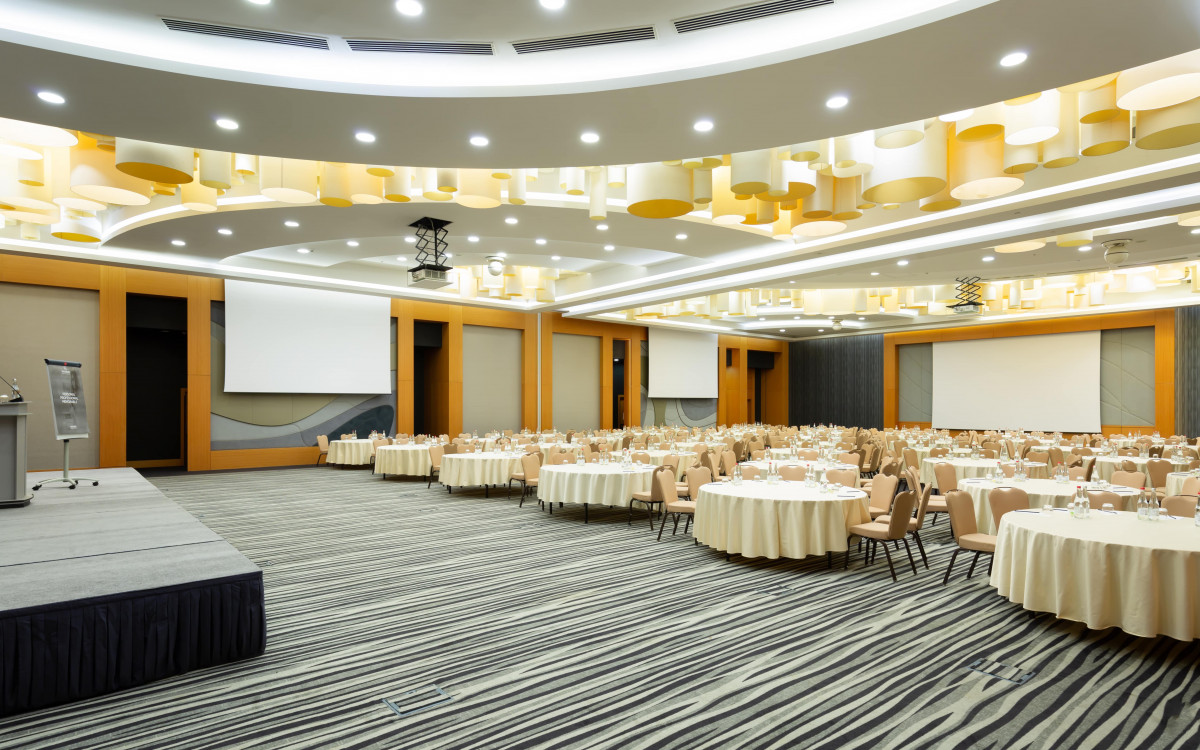 Просторный бальный зал площадью 750 кв.м. может быть с легкостью трансформирован в два зала площадью 350 кв.м. и стать площадкой для вашего мероприятия. Максимальная вместимость зала 420 человек