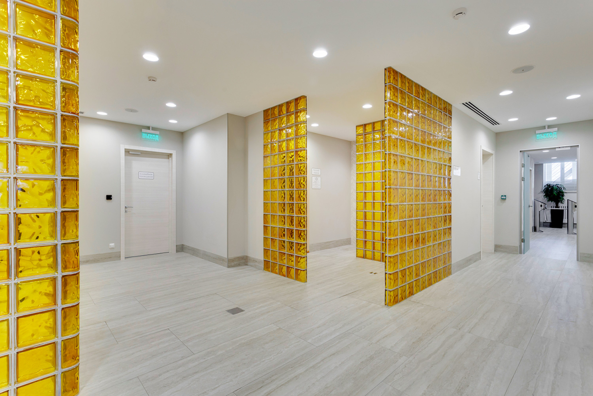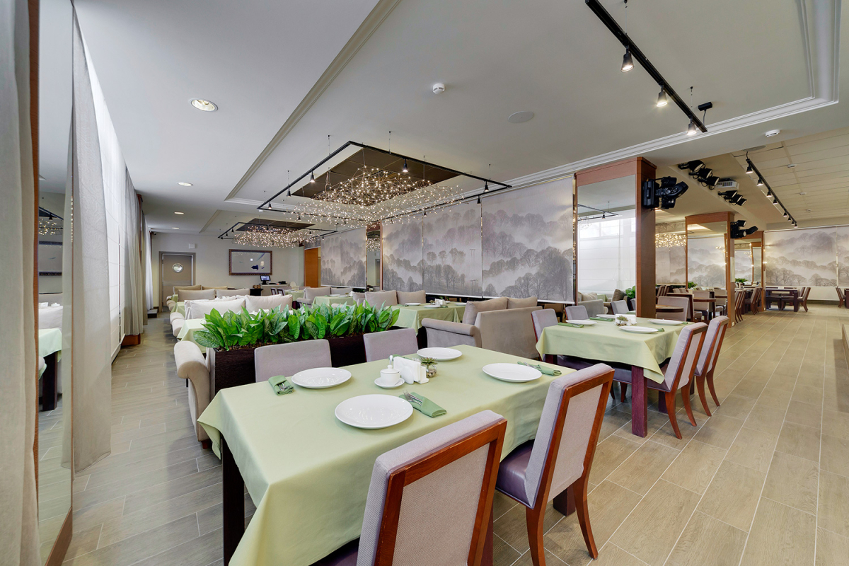 Современный банкетный зал с панорамными окнами, с видом на парк разместился на втором этаже.