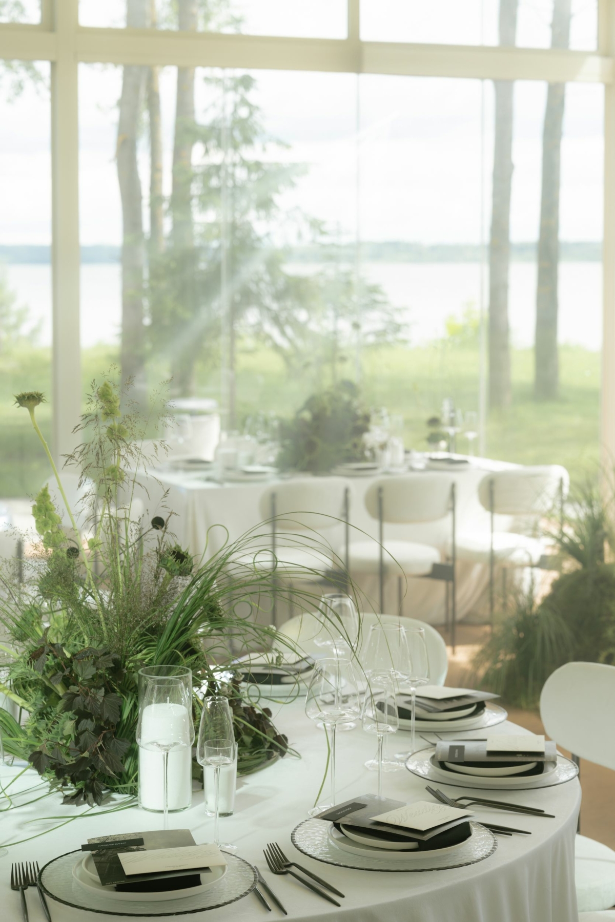 Банкетный зал сферической формы в стиле HI-TECH из натурального дерева с панорамным остеклением и видом на живописное озеро Сенеж.
