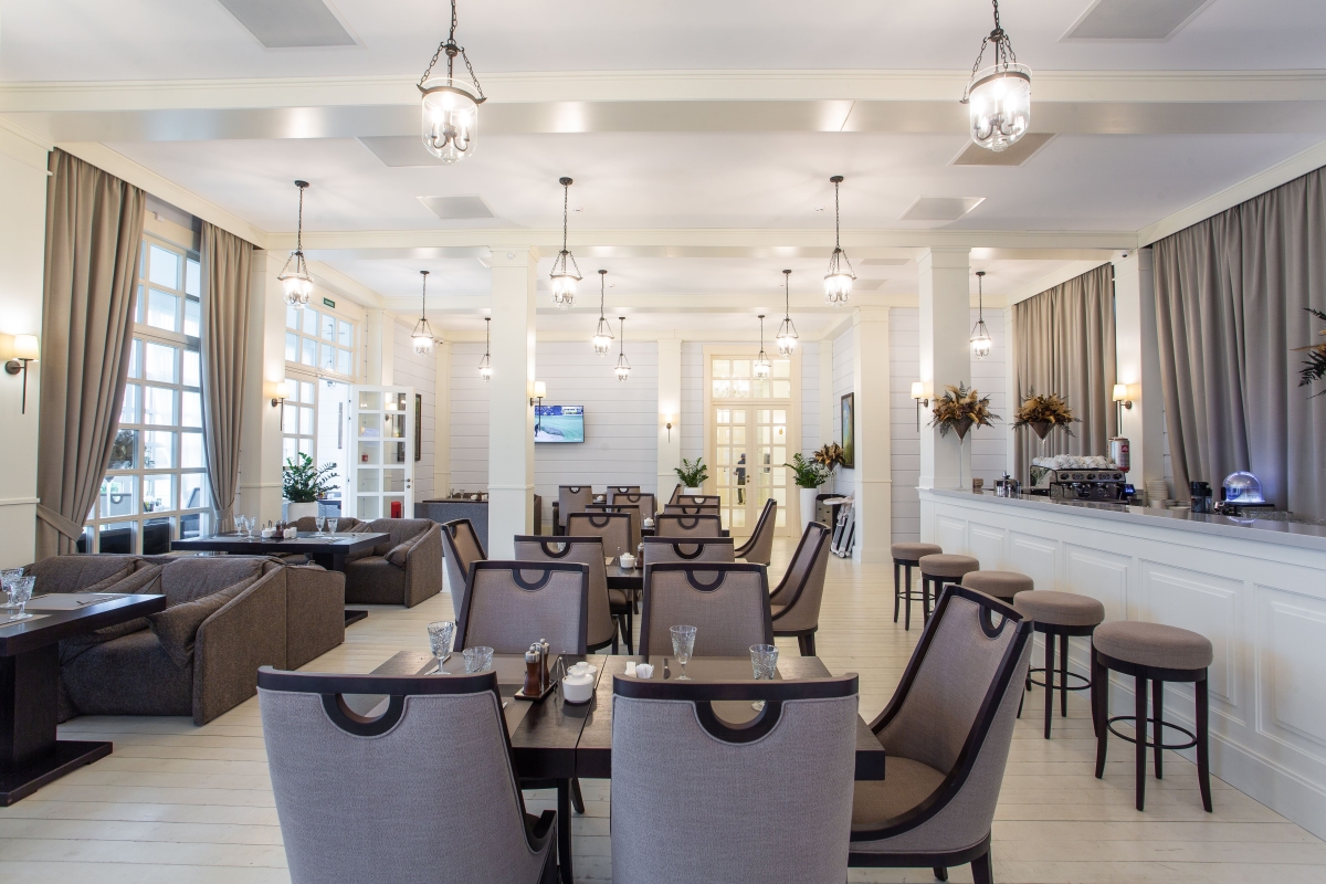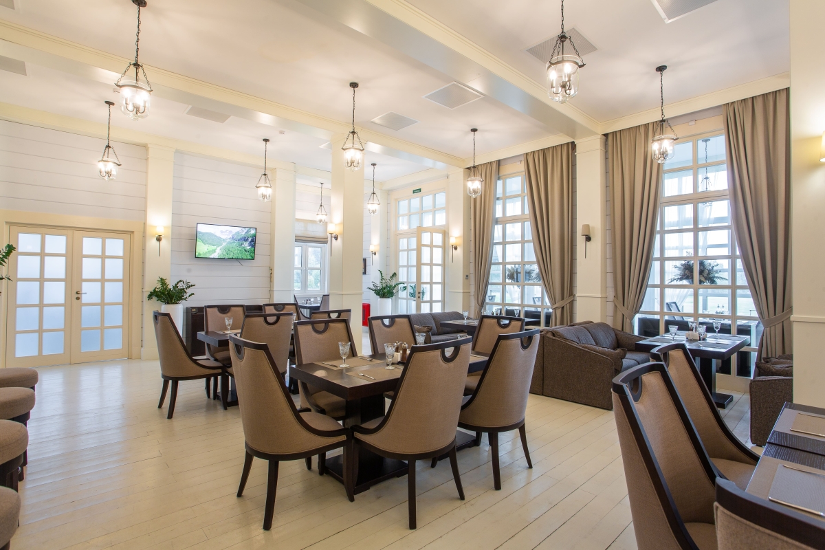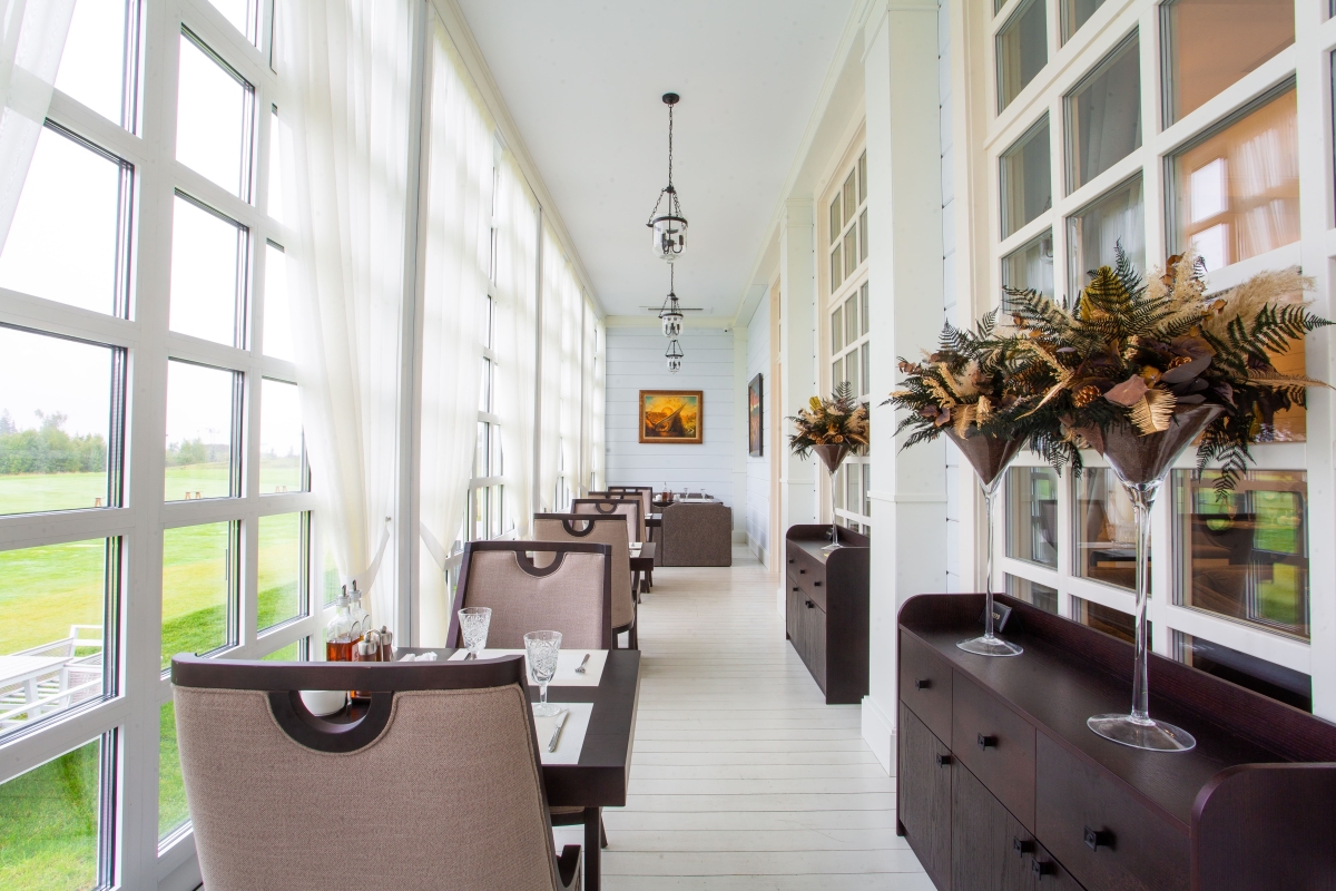 Идеальная площадка для проведения торжества в летний период. Светлая, воздушная, просторная, с потрясающим видом на гольф-поле, открывающимся через панорамные окна веранды