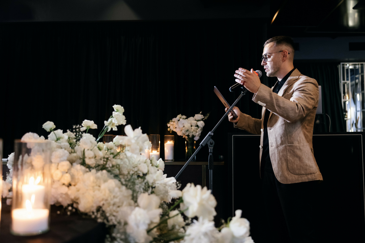 Он не только ведет мероприятия, но и делится своим опытом: помогает коллегам прокачивать чувство юмора и развивает навык уверенно держаться на сцене.
