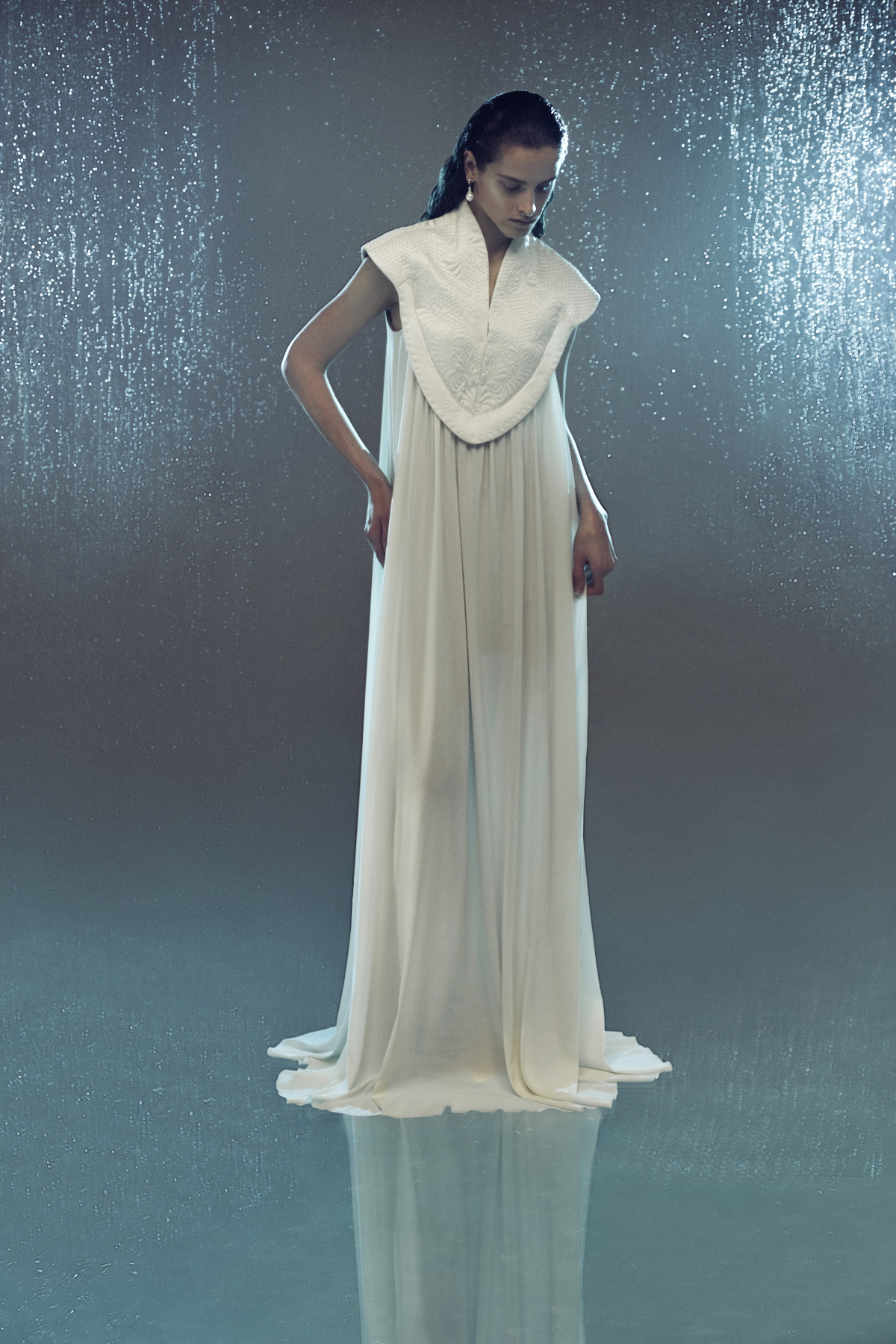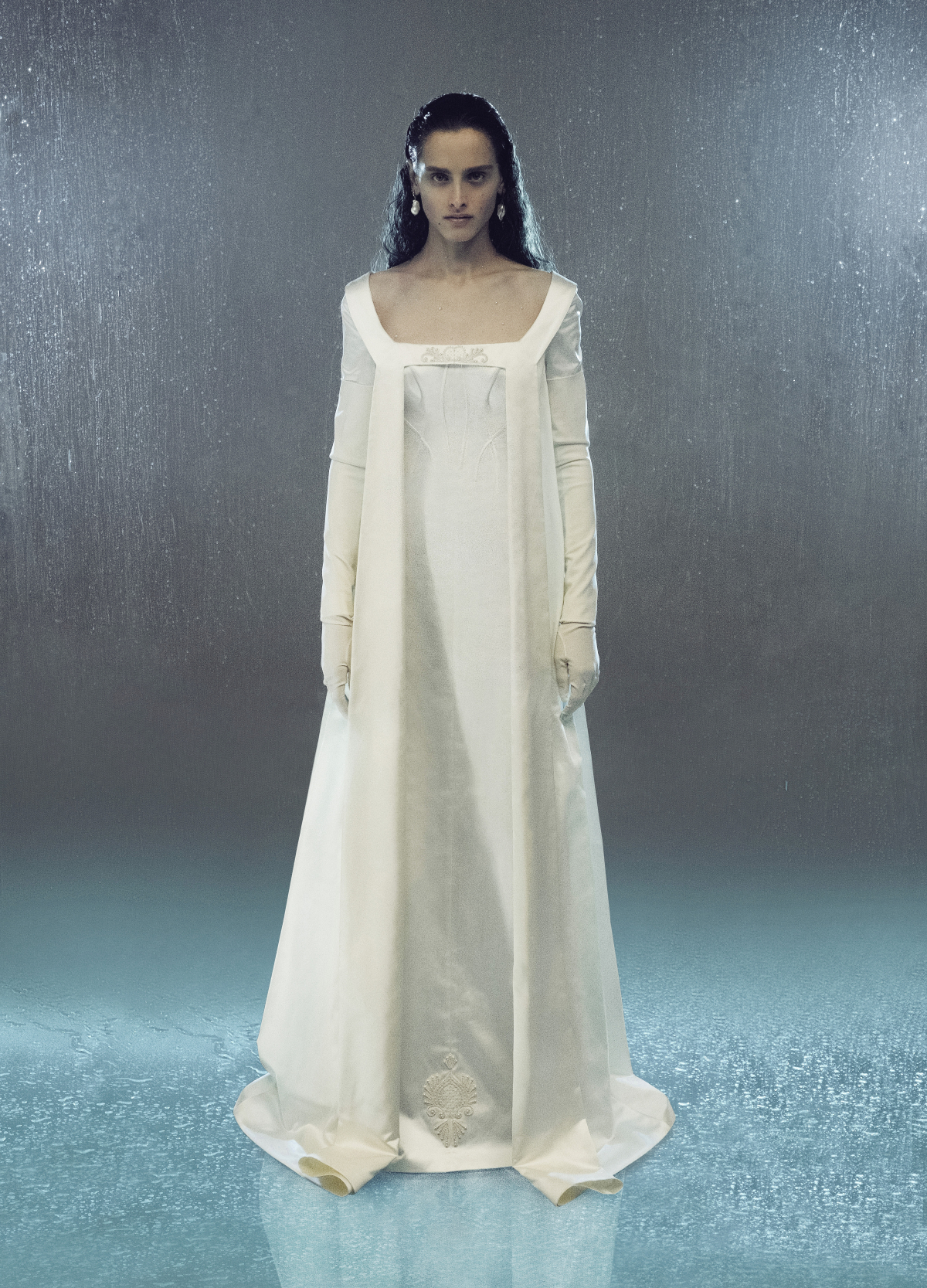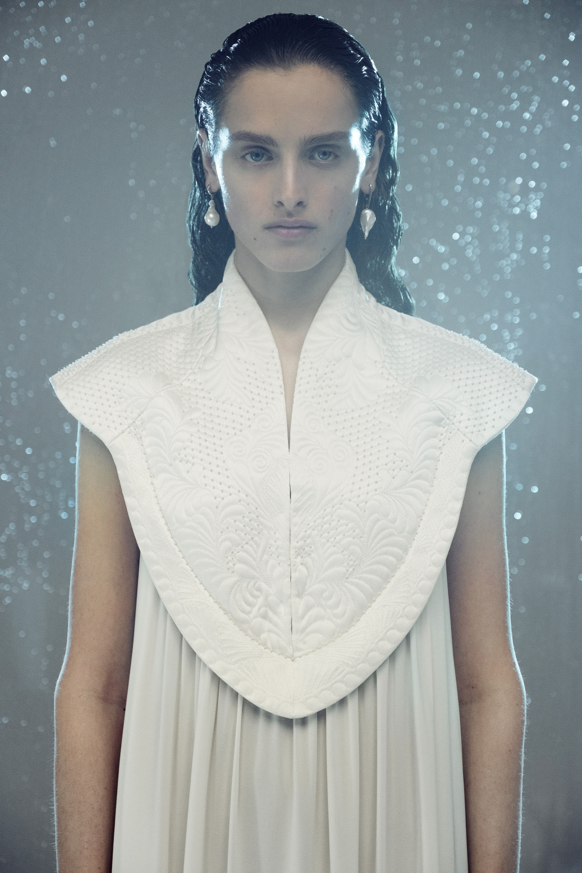 Каждое платье EDEM начинается с исследования: архивов, старинных фотографий, религиозных текстов, символики разных эпох. Бренд работает с историческими кодами — от елизаветинской эпохи до восточных традиций — трансформируя их в современный кутюрный образ. В работе используются редкие техники и материалы: французское кружево, сотканное на старинных станках, сложные плиссировки, выполняемые в парижском ателье, шелка, окрашенные специально для дома во Франции и Италии, вышивка канителью — тончайшей серебряной нитью, применяемой в иконописи.